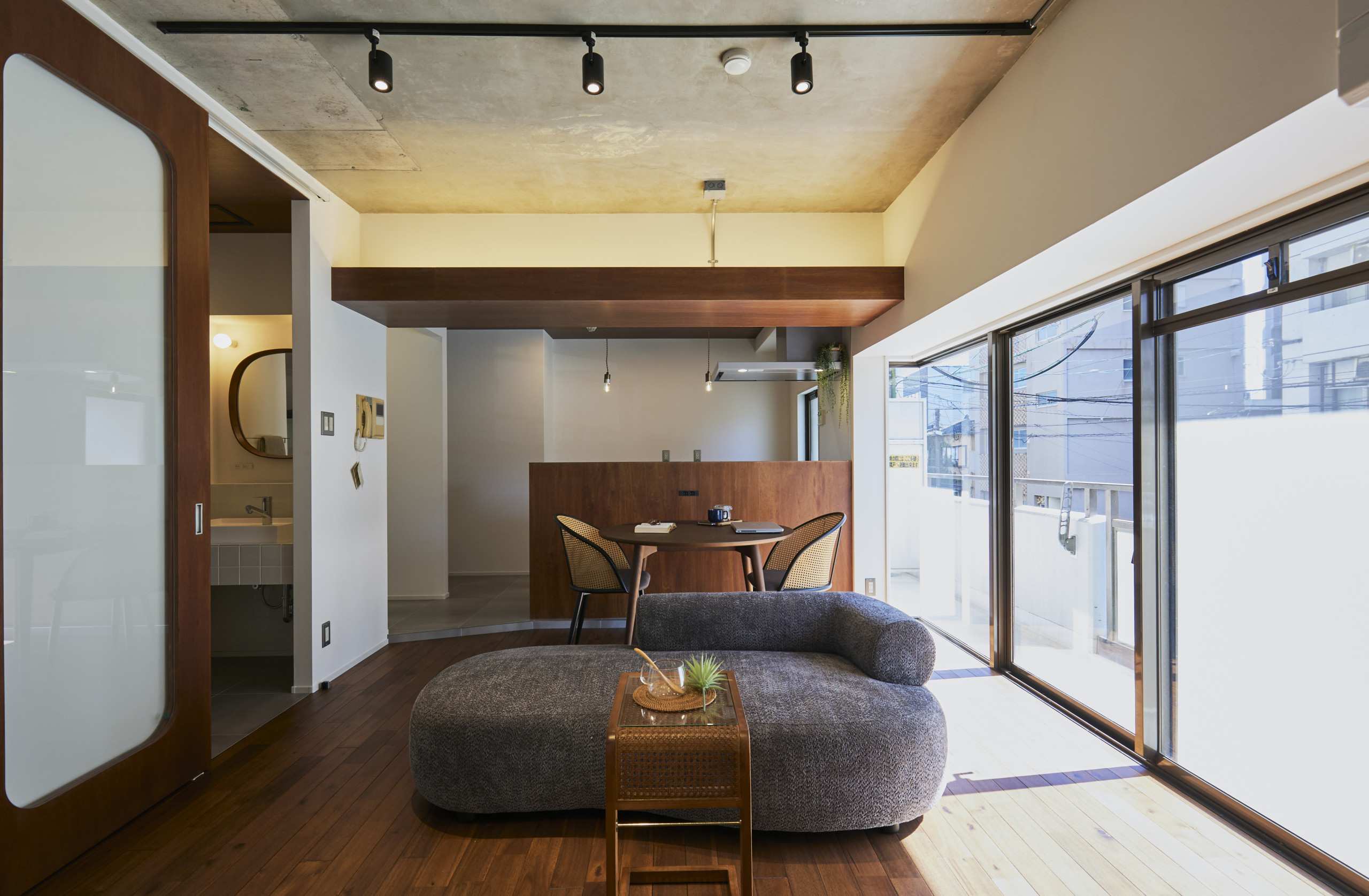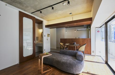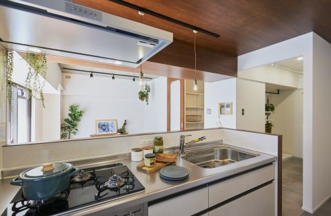 天井はあえて無機質な躯体現しのままに、床やキッチンカウンターには表情豊かな木材をセレクト。